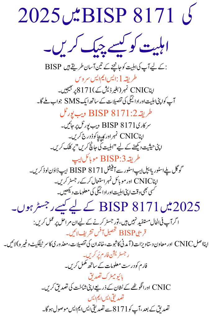 | BISP 8171 (Benazir Income Support Programme) | 2008 (continuing, with 2025 updates) | Ongoing | Rs. 13,500 per family (quarterly) | Online (Web Portal, Mobile App, SMS) & Offline (BISP Tehsil Offices) |