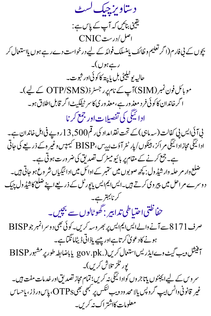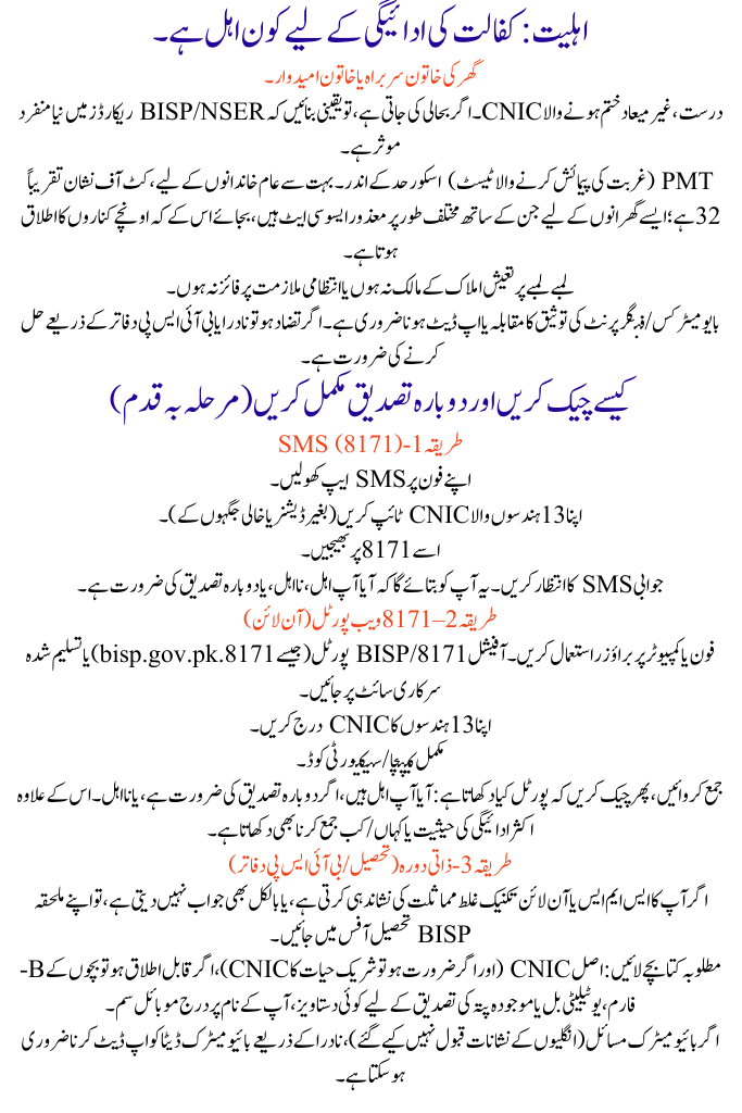 BISP 8171 Re-Verification & Kafaalat Payment September 2025Early September 2025End-September 2025 (district-wise phases) Rs 13,500 per eligible family (quarterly Kafaalat) Via SMS to 8171; via official 8171 Web Portal; or in-person at BISP / Tehsil offices with required documents