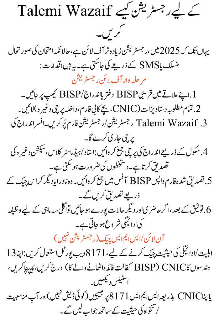 As of 2025, registration is mostly off (visit BISP office). There is no fully authorized, reliable online registration form for Taleemi Wazaif.